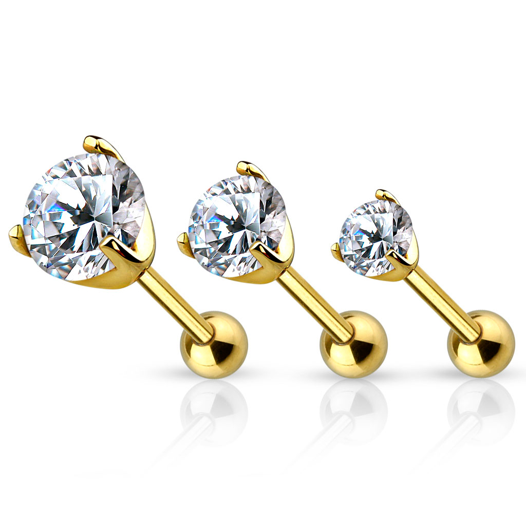 Przyszedł czas, aby zaprezentować ten luksusowy zestaw trzech kolczyków do ucha wykonanych ze złota. Te śliczne kolczyki mają grubość 1,2 mm, dlatego pasują do przekłuć, które zostały wykonane igłą. Każdy z kolczyków jest zdobiony przezroczystym kamieniem i mają one następujące rozmiary: 2 mm, 3 mm oraz 4 mm.